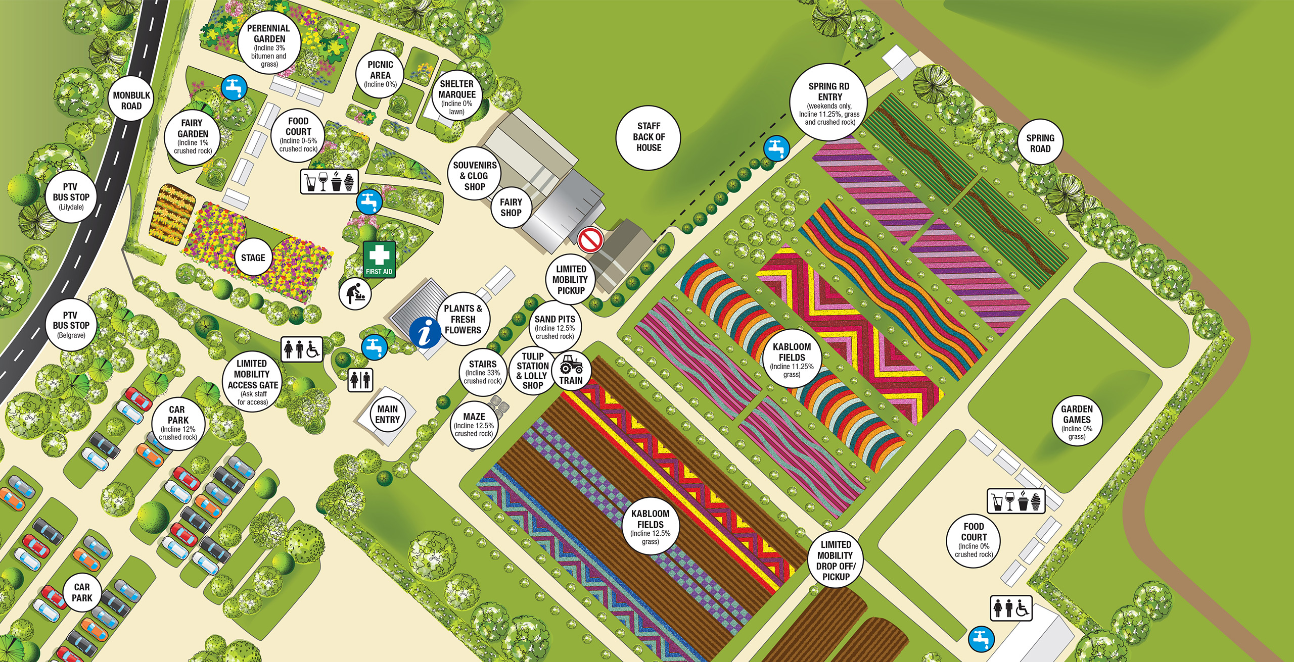 Our Historic Gardens are flat, with bitumen and cement paths. This area contains show gardens, a food court, souvenir shops, performance area/stage and accessible bathroom facility.